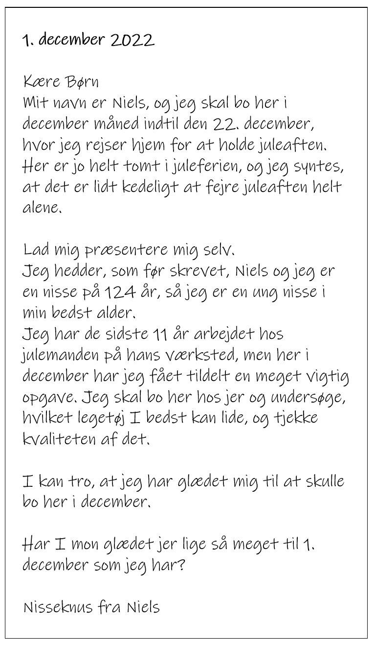 Niels skriver et brev til børnene hver hverdag, hvor han fortæller om hvad han laver, giver forslag til opgaver, og laver gåder. Det er lidt op til den individuelle institution, hvor meget de vil leve sig ind i nisseverdenen.
